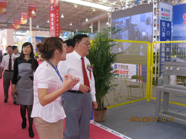 2013年5月18—20日,第八届中国(潍坊)国际门窗幕墙及设备展览会在潍坊富华国际会展中心举行。天辰铝机在此次展会上展示了门窗幕墙高端锯切自动线、数控加工中心等产品,得到行业领导的肯定及广大客商的好评!中国住建部中国金属结构协会会长姚兵及秘书长刘哲在山东省住建厅张厅长的陪同下参观了天辰铝机,给予了高度评价!