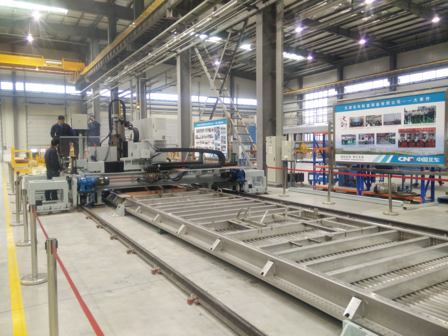 超长数控四轴龙门加工中心有效加工长度近30米,可实现四轴联动加工,并配置12刀位旋转刀库、大功率HSD高速电主轴及双端锯切装置,主要适用于高铁等轨道交通车体铝型材的高速钻铣、锯切加工;数控钻铣中心采用框架式龙门结构,机床刚性好,可完成复杂三轴联动加工,适合碳钢、高强度不锈钢等车体的高效粗、精加工,主要用于轨道交通车辆底架与转向架连接处的平面、定位孔等工序的加工,具备铣削、钻削、镗孔及攻螺纹等功能。