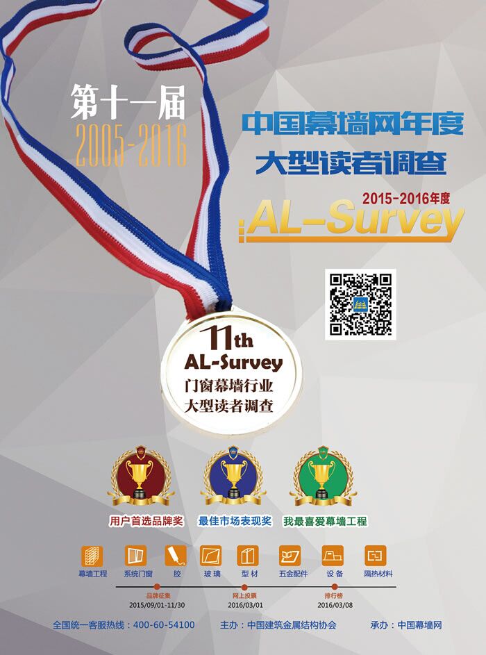 ????? “AL”是铝门窗幕墙委员会aluminum的英文开头首母,“AL”还代表铝的元素符号,同时,“AL”是中国幕墙网域名ALwindoor的简写,“Survey”则代表调查。