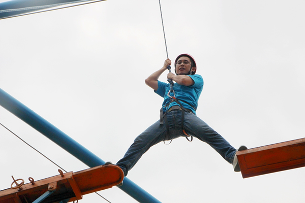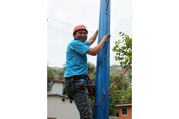 此次拓展训练加大了难度,增加了高空断桥项目。挑战人员需自行爬上八米的立柱,从很窄的木板上走过,然后跨越到一米半以外的另一块木板上,然后从两块木板中间跳下。虽然有保险绳保护,但对于参与者的心理和体力还是一个很大的挑战。