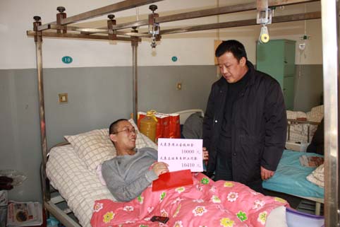 ??? 在重症监护室抢救治疗期间,医疗费高达18万余元,这对一个工薪家庭来说是一个巨大的数字和沉重的压力。面对此种情况,公司领导冲上前去,八方协调:侯可斌总经理在小郭入院当晚,不仅结算了前期的检查治疗费用,还垫付了10000元现金为小郭办理了住院手续;组织全体员工为小郭捐款10410元;经公司申请、集团工会委员会研究、侯秀峰董事长批准,从集团互助金中拿出10000元对小郭进行救助。